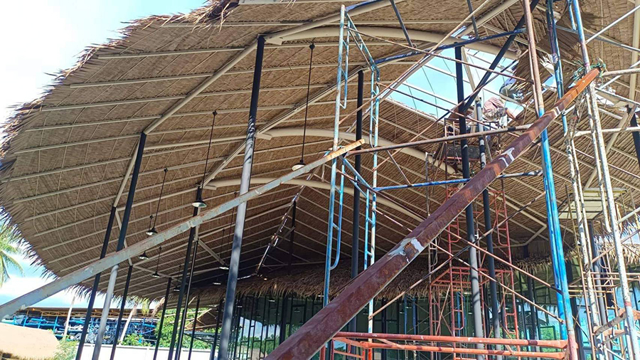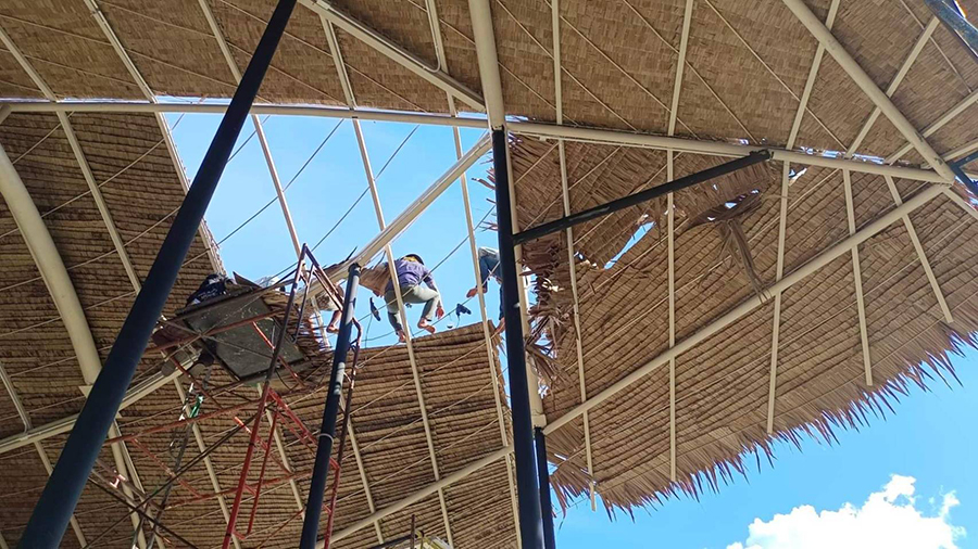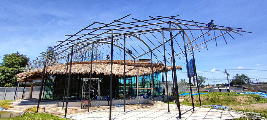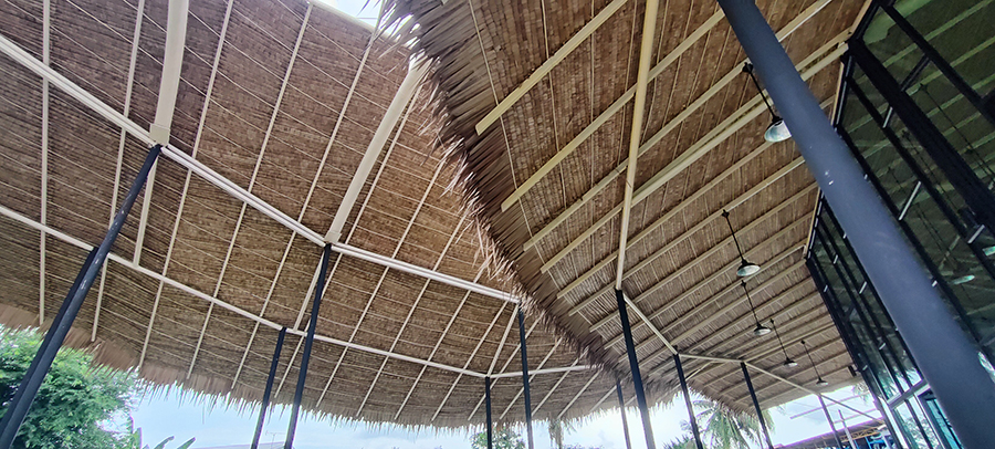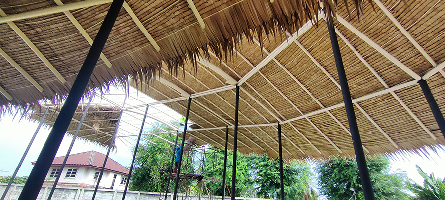 เป็นงานมุงหลังคาอาคารร้านคาเฟ่ด้วยตับจาก โดยโครงสร้างหลังคาเป็นเหล็ก และยึดหลังคาด้วยสกรูแบบเรียงถี่ เรียงตามรูปทรงหลังคาเพื่อความสวยงาม อายุการใช้งานไม้ไผ่ไม่น้อยกว่า 10 ปี