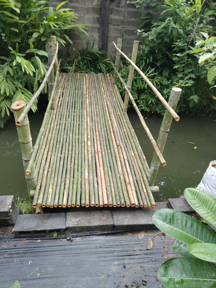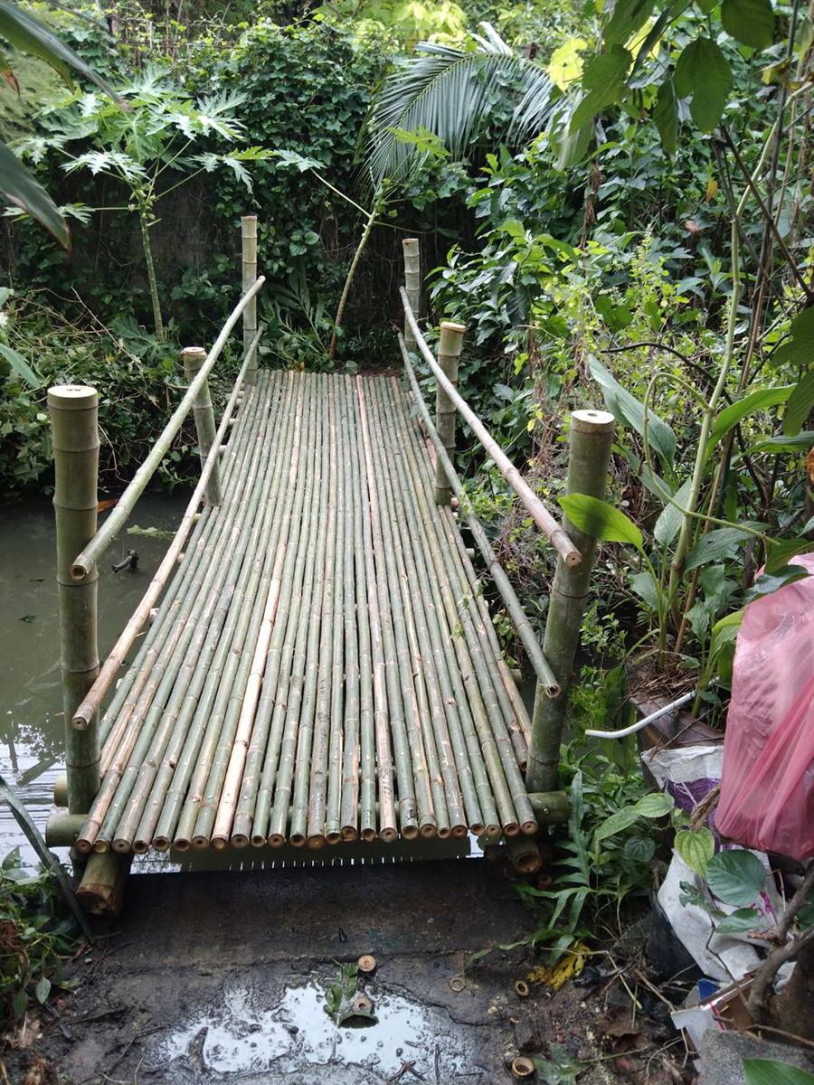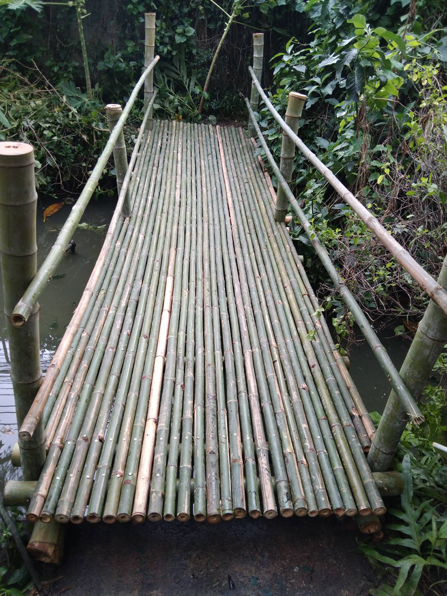 เป็นงานก่อสร้างสะพานไม้ไผ่ข้ามร่องสวน โดยใช้ไม้ไผ่เป็นเสาและโครงสร้าง แล้วปูพื้นด้วยไม้ไผ่เป็นลำขนาดประมาณ 1 นิ้ว มีราวจับ สวยงาม แข็งแรง อายุการใช้งานประมาณ 5 ปี ขึ้นอยู่กับสภาพแสงแดดและการดูแลรักษา