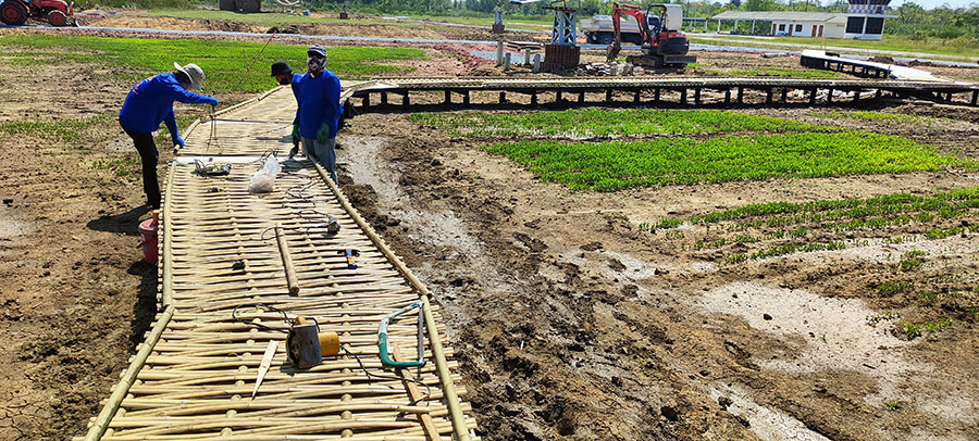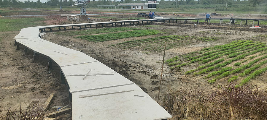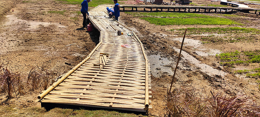 เป็นงานก่อสร้างสะพานไม้ไผ่ขัดแตะสำหรับตกแต่งคาเฟ่ โดยใช้เสาเป็นปูน โครงสร้างพื้นเป็นเหล็กปูพื้นด้วยวีว่าบอร์ด แล้วปูทับด้วยไม้ไผ่สานขัดแตะ ไม่มีราวจับ สวยงาม แข็งแรง อายุการใช้งานประมาณ 5 ปี ขึ้นอยู่กับสภาพแสงแดดและการดูแลรักษา