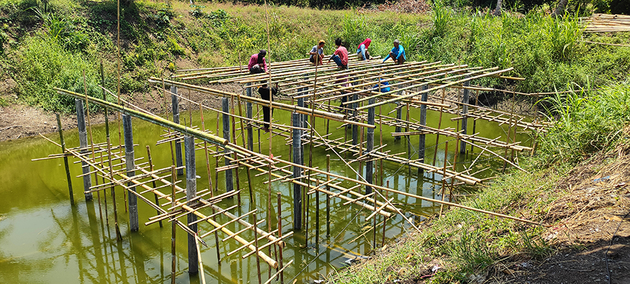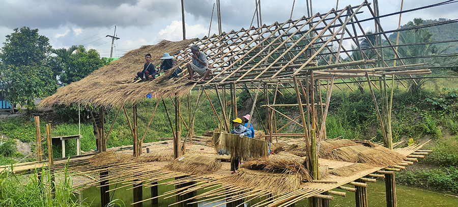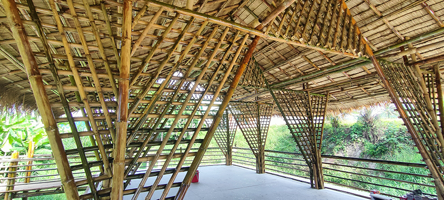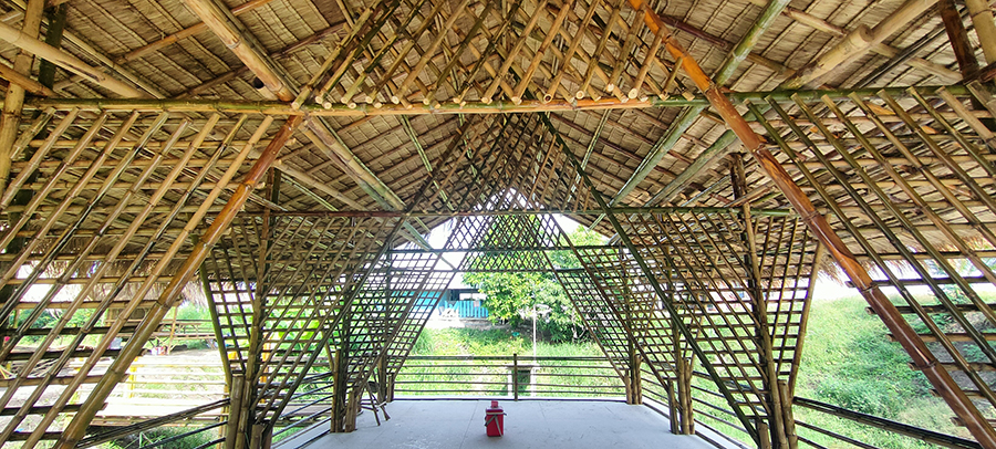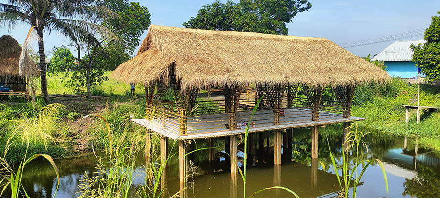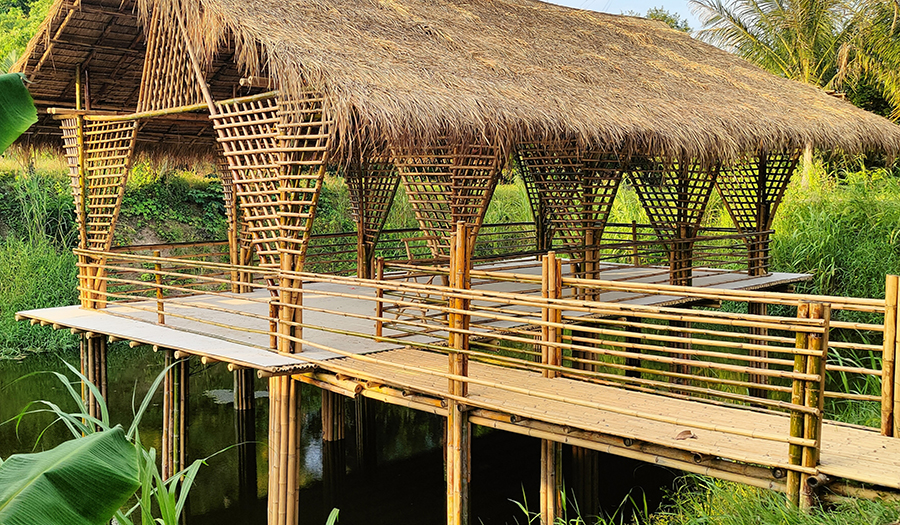 เป็นงานก่อสร้างอาคารไม้ไผ่สำหรับเป็นร้านอาหารกลางบ่อน้ำ โดยเสาเป็นปูนหล่อด้วยท่อใยหิน และโครงสร้างอาคารเป็นไม้ไผ่ มุงหลังคาด้วยหญ้าคา พื้นวีว่าบอร์ด ตกแต่งโครงสร้างหลังคาด้วยไม้ไผ่ มีราวกั้นกันตก มีสะพานเดินเข้าอาคาร อายุการใช้งานไม้ไผ่ไม่น้อยกว่า 10 ปี