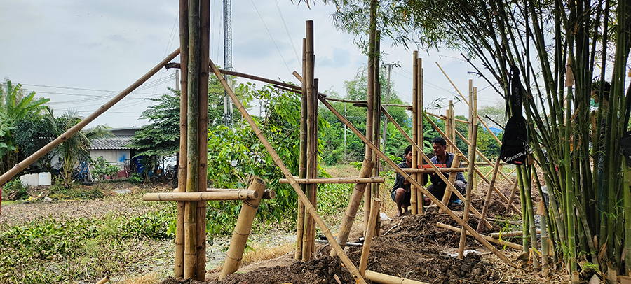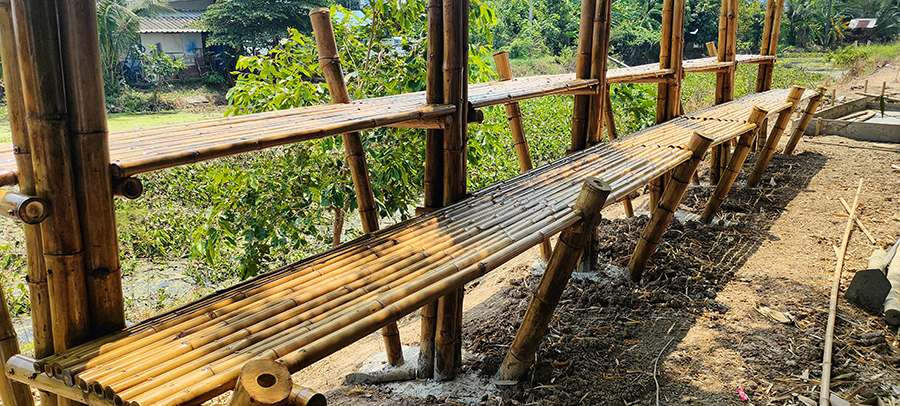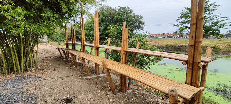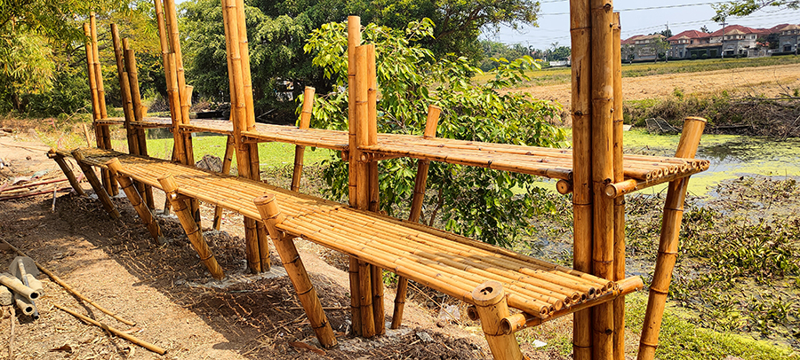 เป็นงานก่อสร้างซุ้มนั่งห้อยขาด้วยไม้ไผ่ เพื่อให้ลูกค้ามานั่งรับประทานอาหาร โดยมีตอม่อเสาปูน เสาไม้ไผ่ ปูพื้นที่นั่งด้วยไม้ไผ่เป็นลำขนาดประมาณ 1 นิ้ว ปูพื้นโต๊ะด้วยไม้ไผ่ผ่าซีก แข็งแรง สวยงาม โดดเด่น อายุการใช้งานประมาณ 5 ปี ขึ้นอยู่กับแสงแดดและการดูแลรักษา